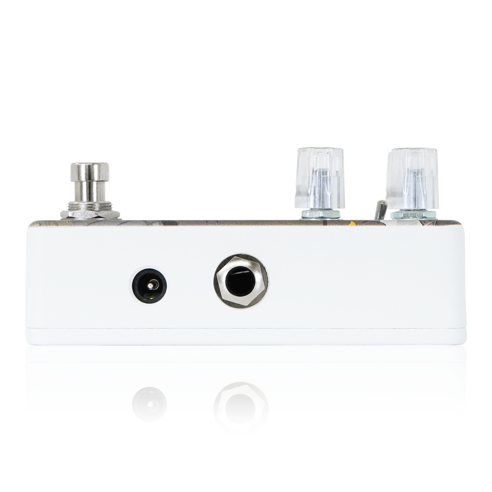 フットスイッチはトゥルーバイパス。9V電池、またはスタンダードなセンターマイナスDC9Vアダプターで駆動します。消費電流が多いため、アダプターでの駆動を推奨します。