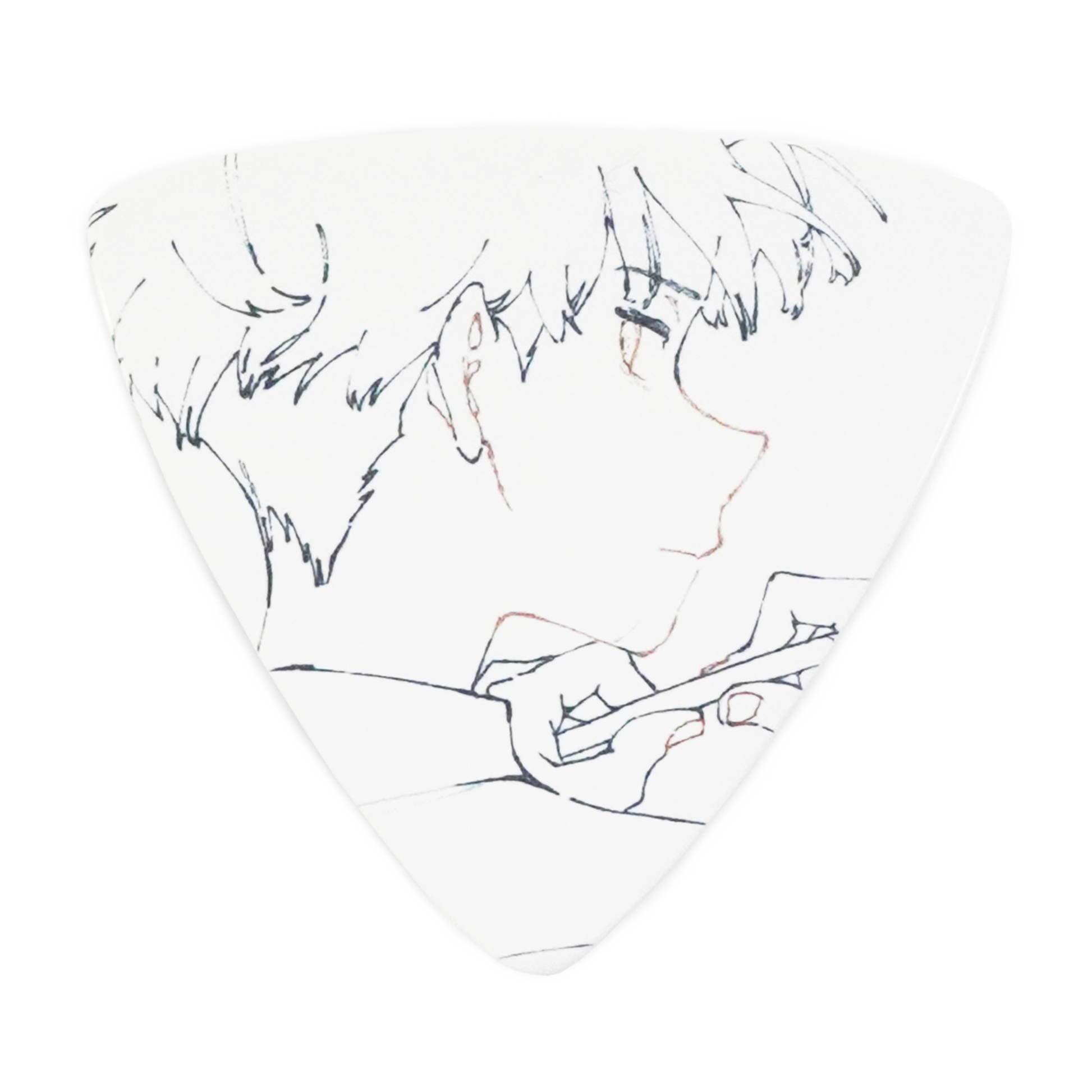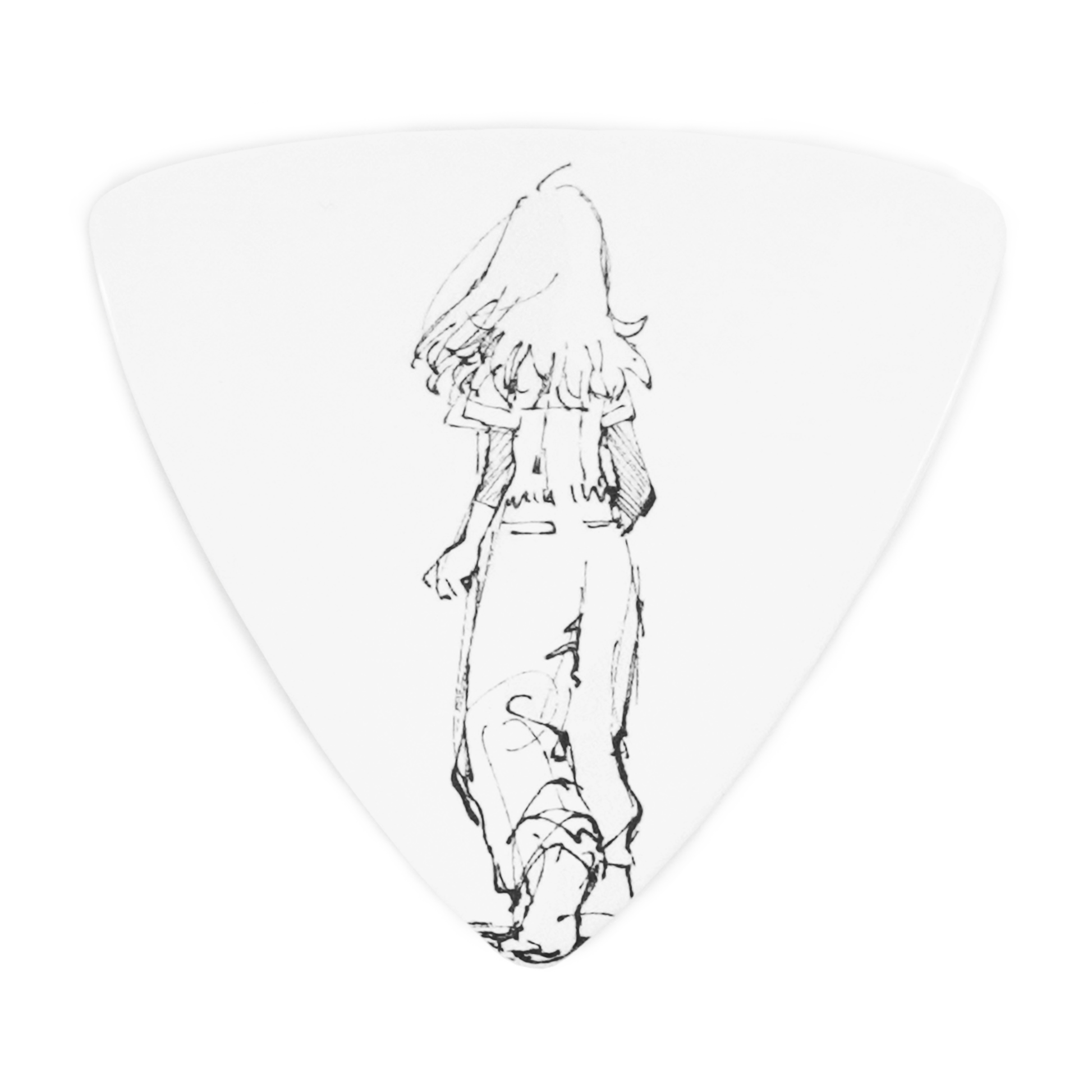 劇中に登場する朝屋彼方、織重 夕、外崎大輔、中川萠美、および劇中で制作されるミュージックビデオに登場するmim、HAREを描いたミディアムタイプのトライアングルピック6枚のセットです。
